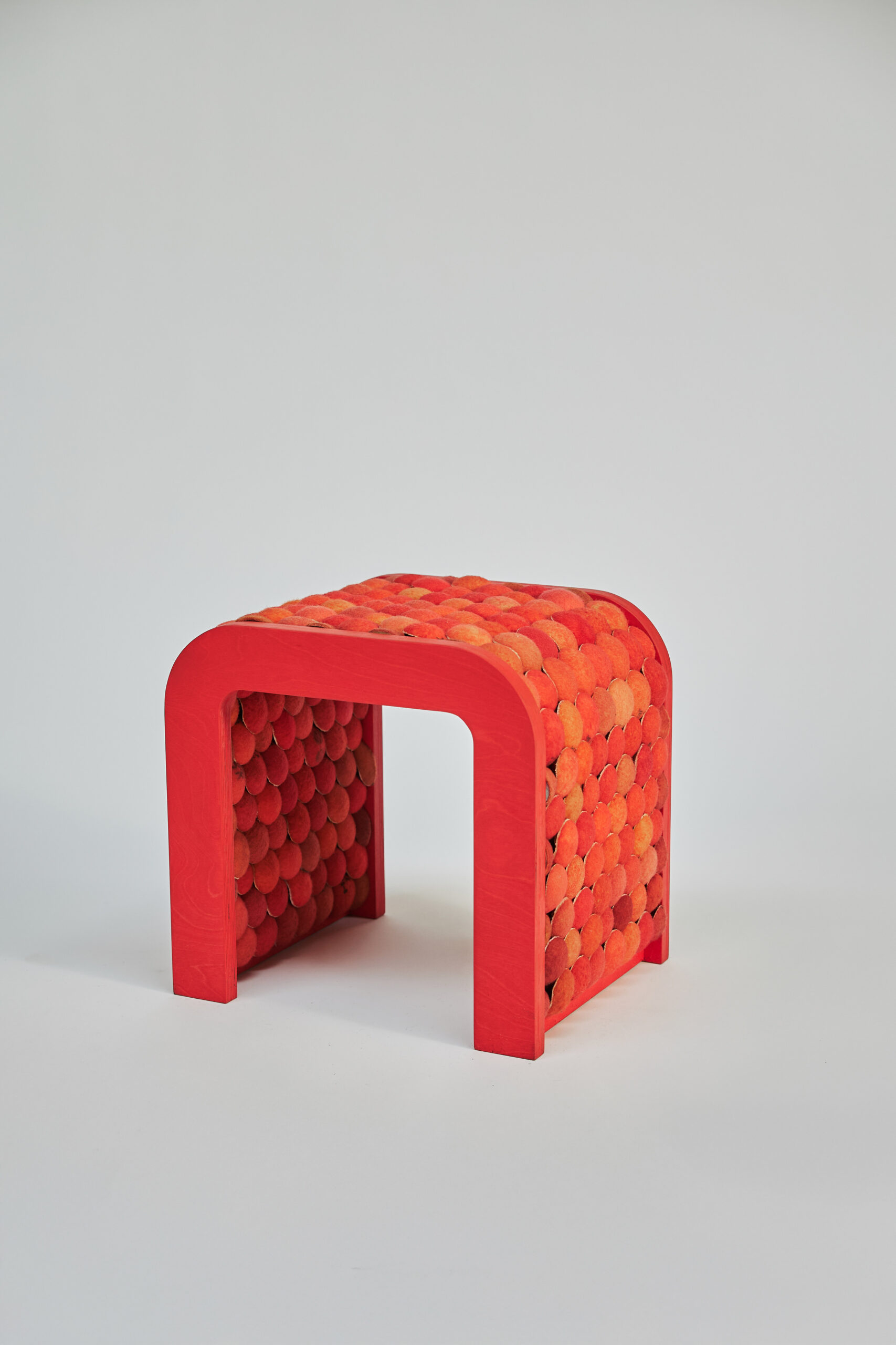 BOUNCE STOOL Bounce Stool Limited Edition The Bounce Stool upcycles 95 tennis balls, representing an estimated 2.9 kg of CO2 emissions removed from the air. Dimensions: 440 x 360 x 415 mm Colour: Red Tones Wood: Red oil finish on birch ask quote →