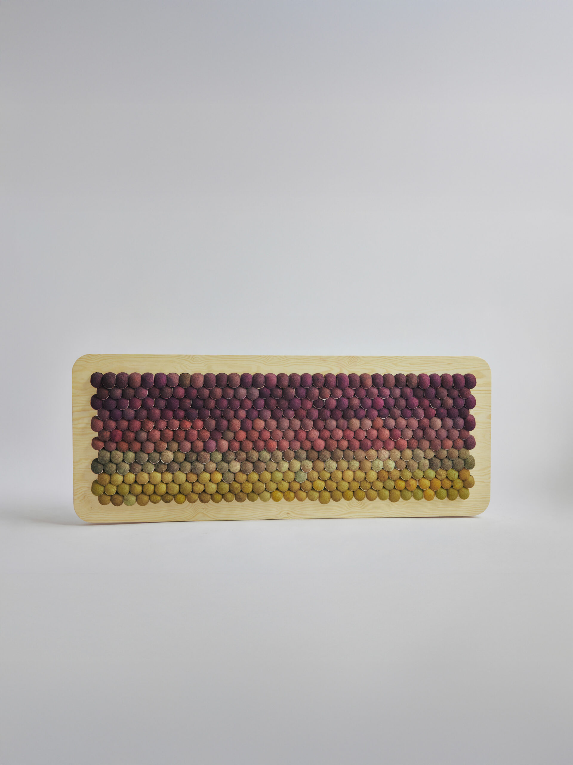 Handcrafted acoustic wall panel, made from around 378 repurposed tennis & paddle balls, contributing to an estimated 11,3kg of CO2 emissions removed from the atmosphere.