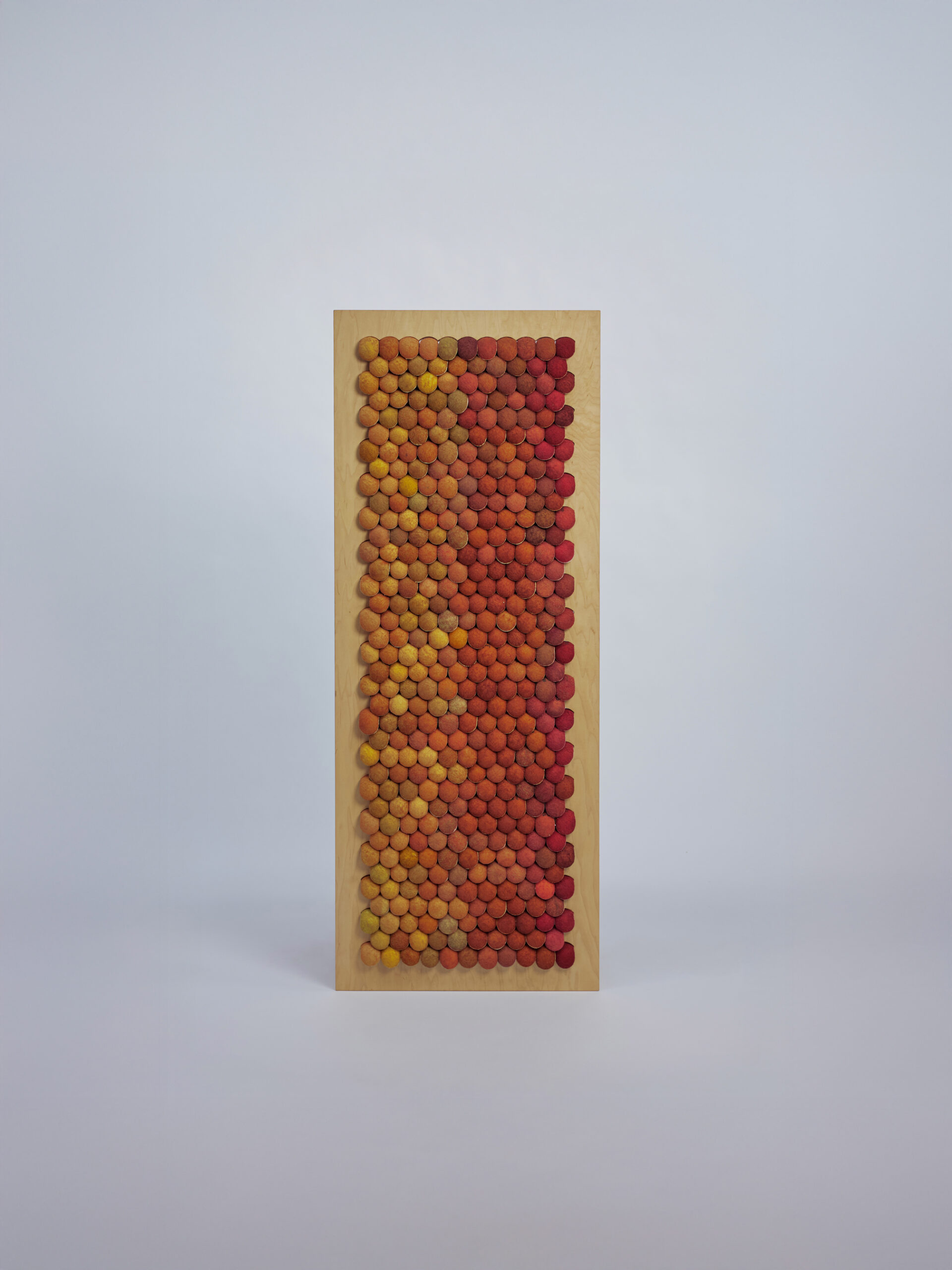 Handcrafted acoustic wall panel, made from around 195 repurposed tennis & paddle balls, contributing to an estimated 5,85 kg of CO2 emissions removed from the atmosphere.