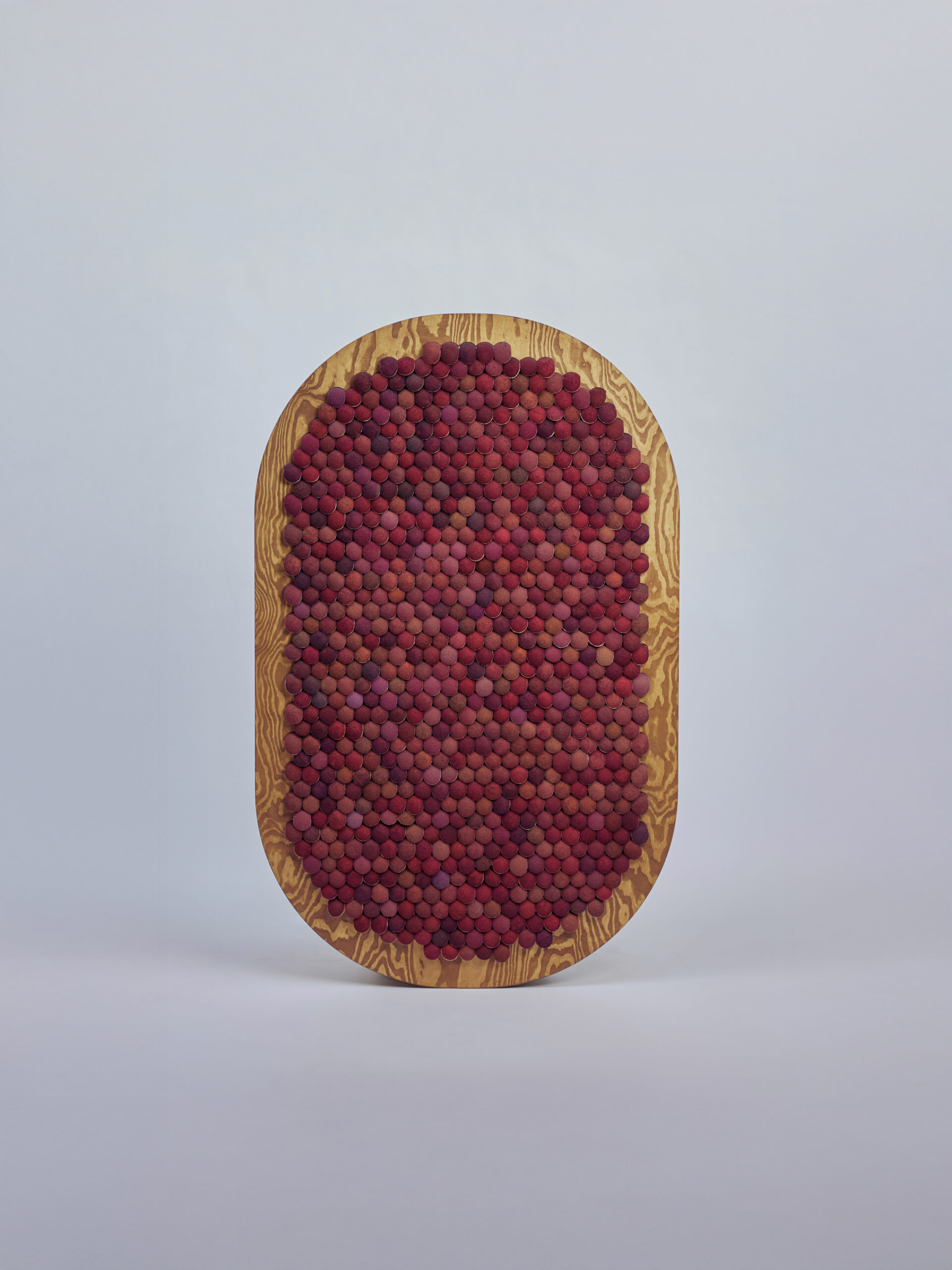 BOUNCE WALL bounce wall MWO edition Handcrafted acoustic wall panel, made from around 750 repurposed tennis & paddle balls, contributing to an estimated 25 kg of CO2 emissions removed from the atmosphere. Colours: Auber tones Wood : Oak finish on pine Dimensions: 108 x 172 x 11 cm ask quote →