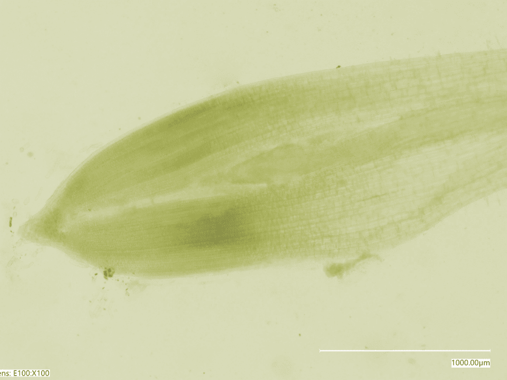 This microscopic image reveals the grass root apical meristem, the region where regenerative stem cells divide and drive root growth.